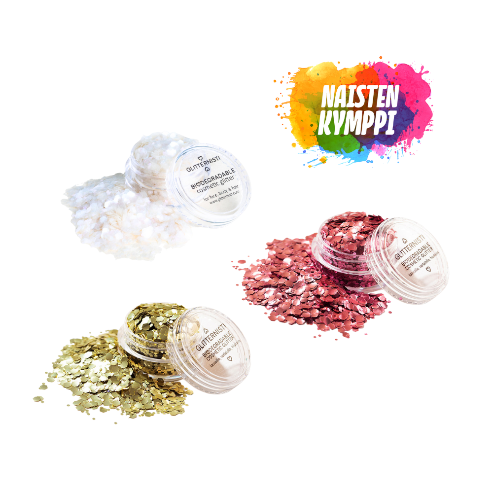 Nosta Naisten Kympin DISCO-fiilis aivan uudelle tasolle ja loihdi kasvoillesi tapahtuman teemaan sopiva helppo glittermeikki! Tämä limited edition -glittersetti on suunniteltu yhdessä Naisten Kympin kanssa ja se tuo tapahtuman energian, yhteisöllisyyden ja juhlatunnelman suoraan lookiisi.