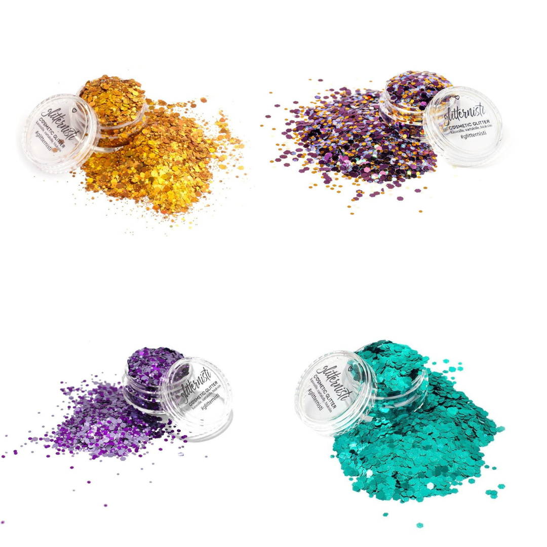 Sale Bundle glittersetti koostuu neljästä mallistostamme poistuvasta (ja siksi) alennuksessa olevasta kosmeettisesta glitteristä. Settiin kuuluu Super Gold, Confetti, Violets ja Jade Bomb glitterit.