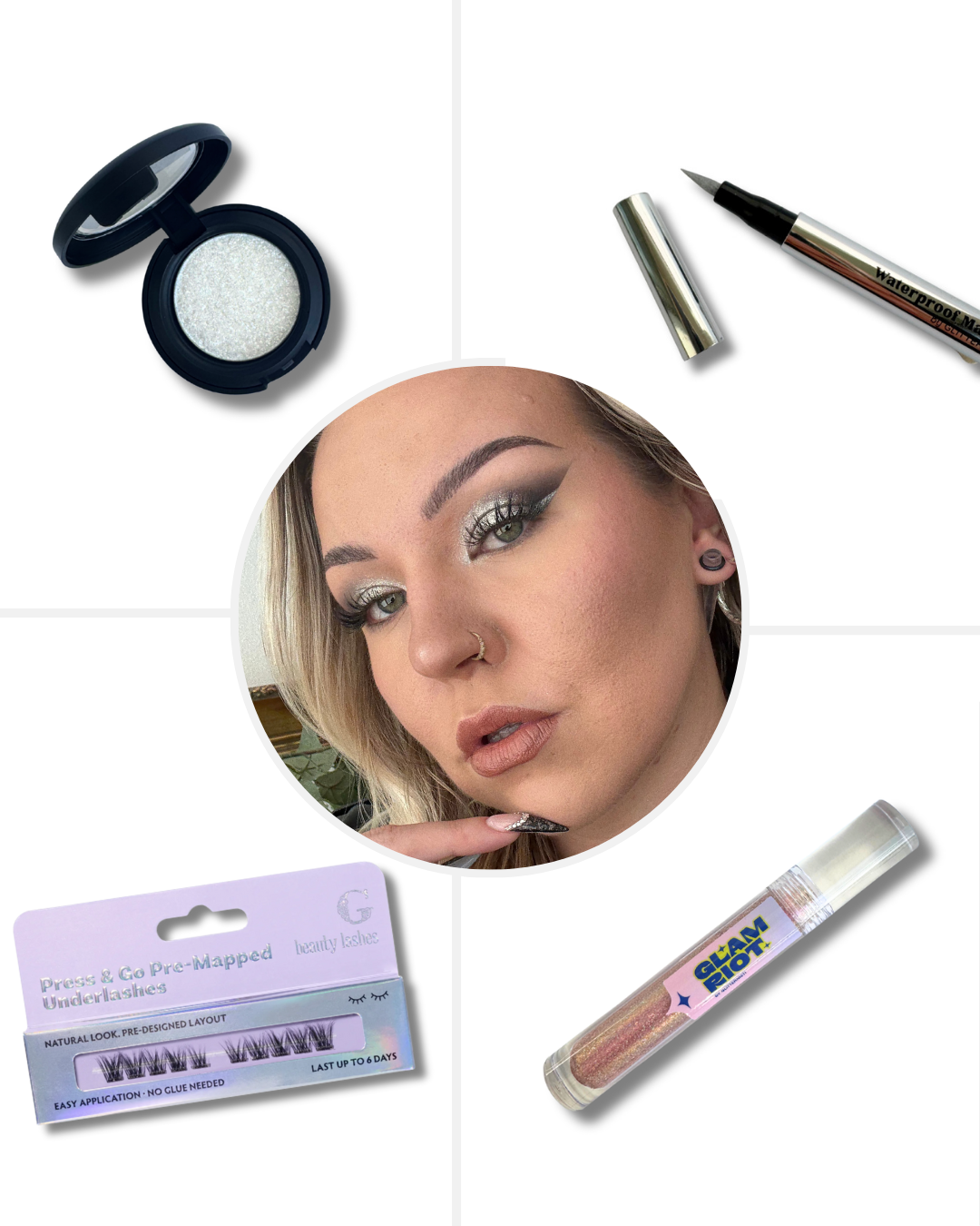 Shop the Look Silver Glam setistä löydät kaikki tarpeelliset tuotteet kuvassa näkyvän upean meikin tekemiseen: Silver Rebel metallinhohtoinen luomiväri, Silver Metallic Eyeliner, Daze Press & Go Premapped irtoripset ja Glam Riot Rose Gold Vandal glitter huulikiilto.
