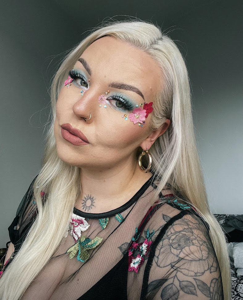 Complete your makeup before adding Face Flowers. Apply a small amount of adhesive to your skin, considering facial and body movements. Use tweezers for placement, and finish the look with Glitternisti glitter and/or face diamonds. Flowers are mostly single-use.