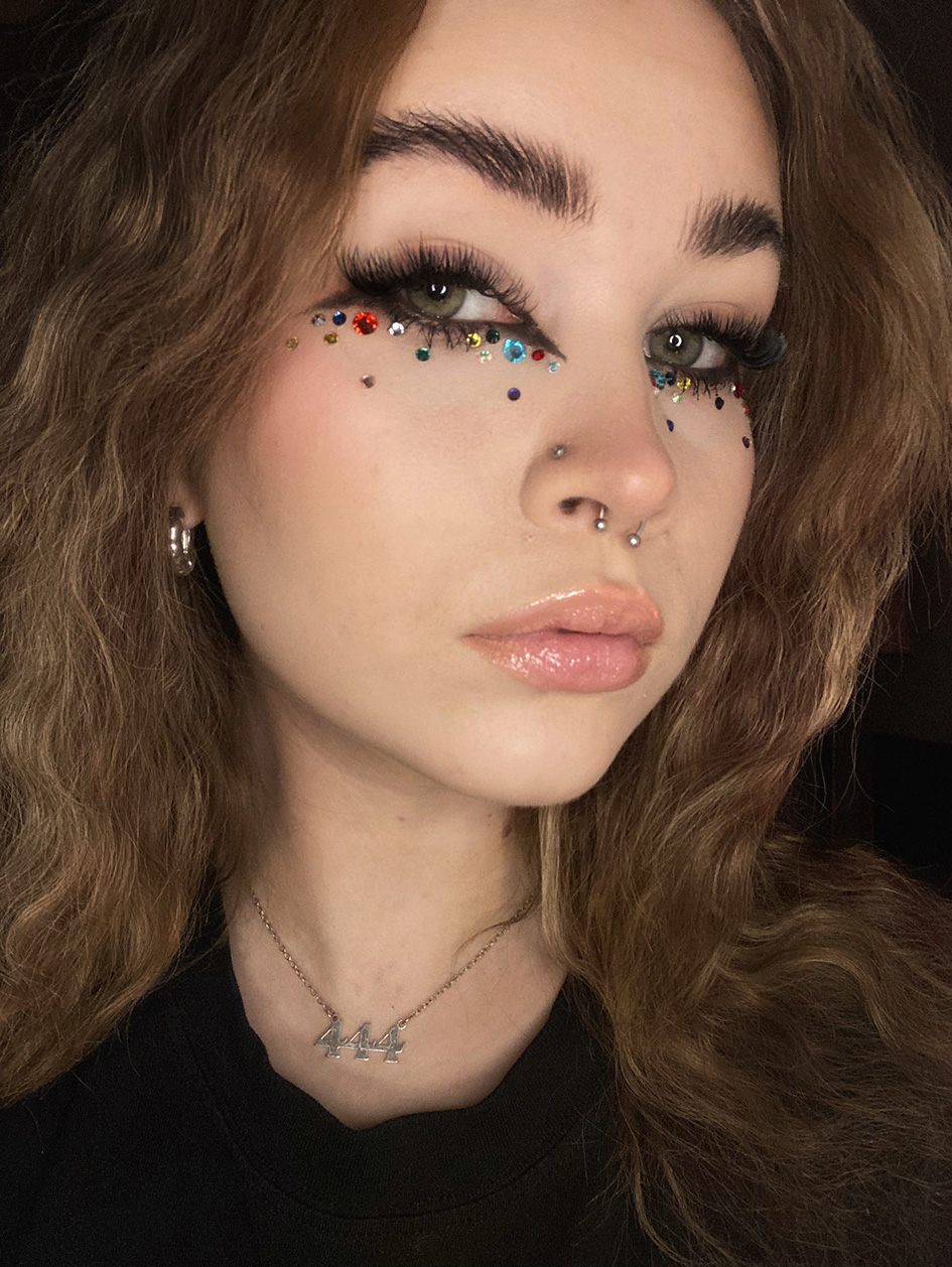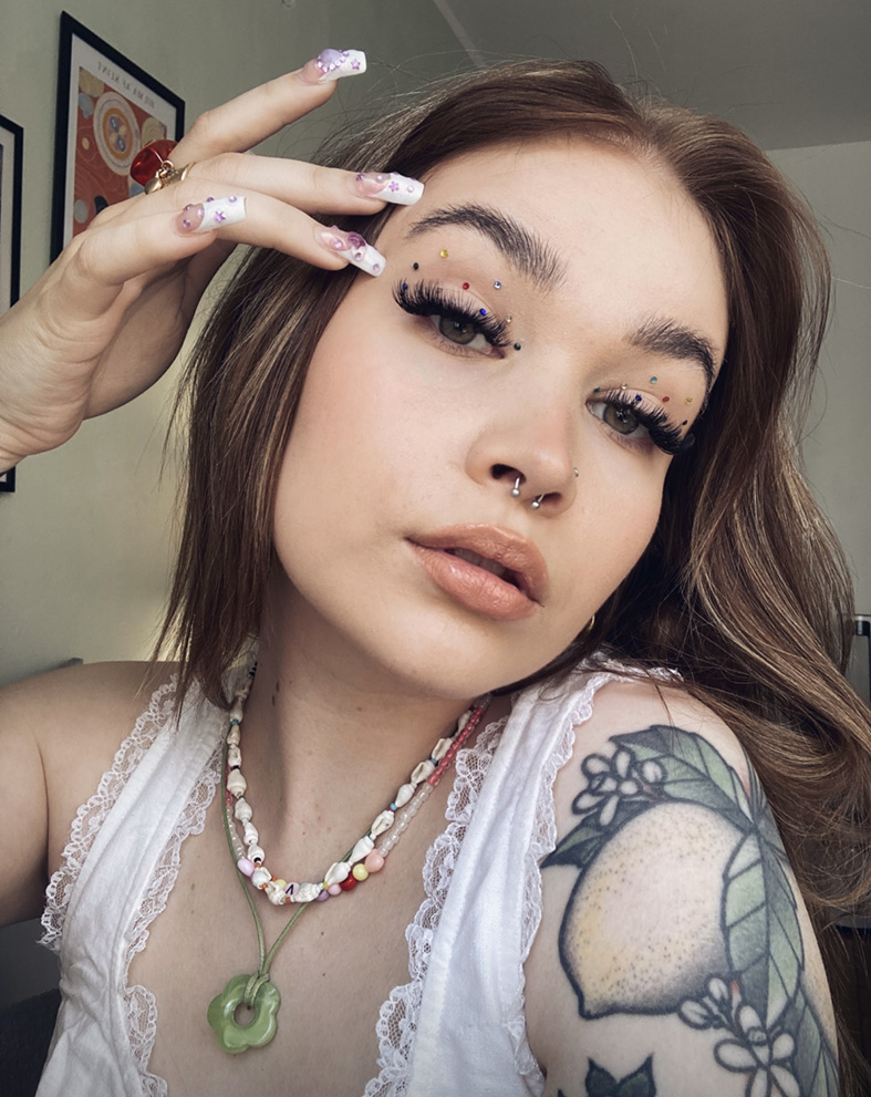 Face gems aren’t just for your face. Apply them to your hair, chest, back, forehead, temples, under the eyes, cheeks, nails, and more.