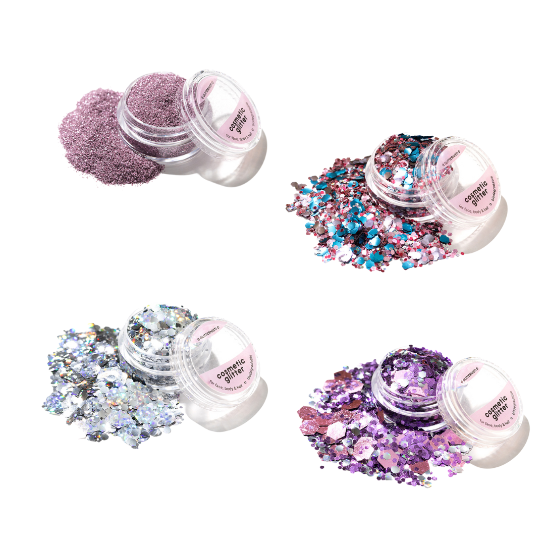 The Pink Stardust Ecoglitter Set includes four eco-friendly glitters in the shades: Fine Light Pink, Circus Mix, Fiji XL (eco version), and Samos XL. This set is a perfect choice for parties, friend groups, or anyone who loves pink sparkle!Add Ecoglitter to the corners of your eyes, nails, cheekbones, or even your hair. Read more about how to apply the glitter here! Find our other wonderful ecoglitters here.