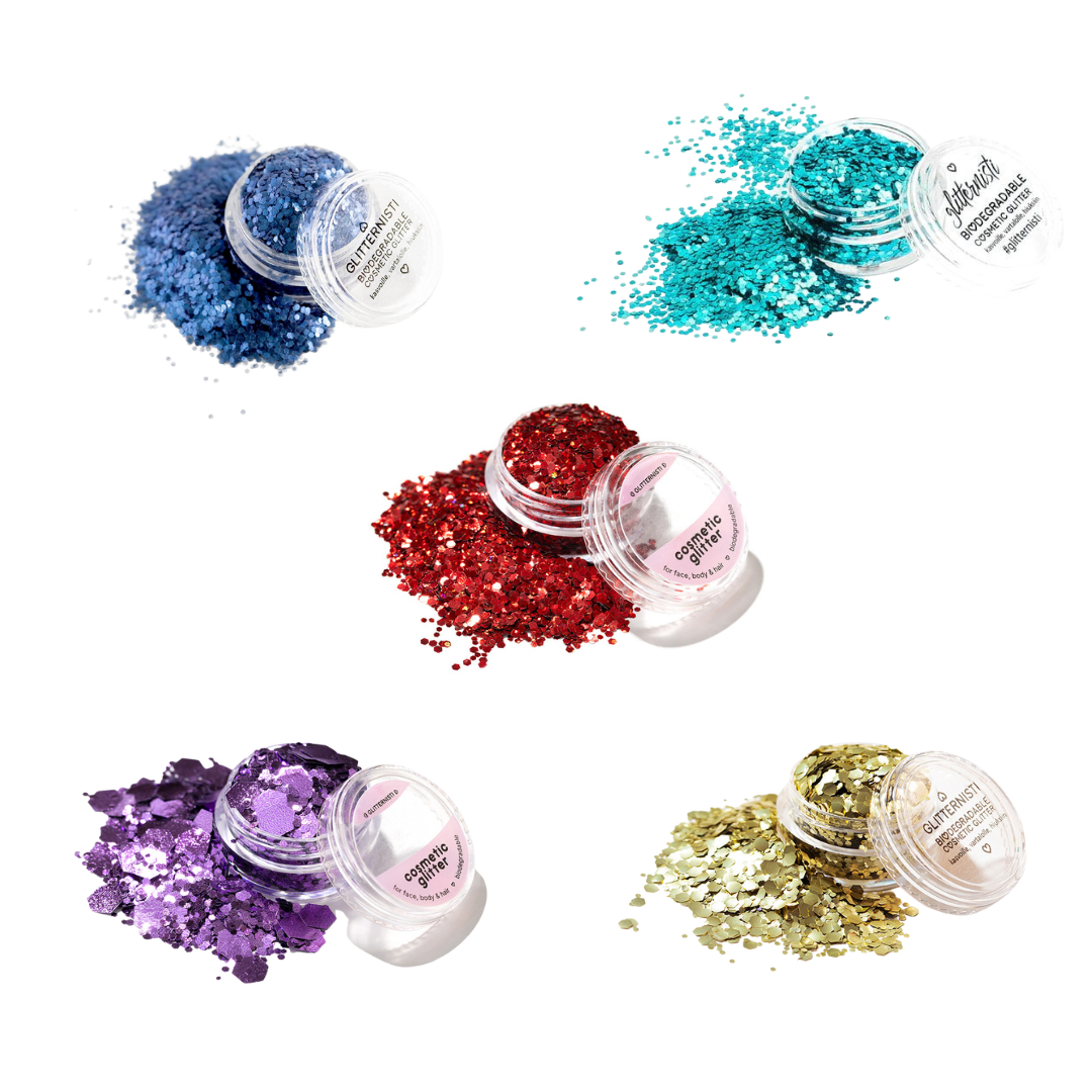 Glitternisti’s Ecoglitter offers everything you love about cosmetic glitter—without the guilt. Our ecoglitter range is specially designed for cosmetic use and made from plant-based cellulose, making it a more eco-conscious alternative to traditional plastic-based glitter.